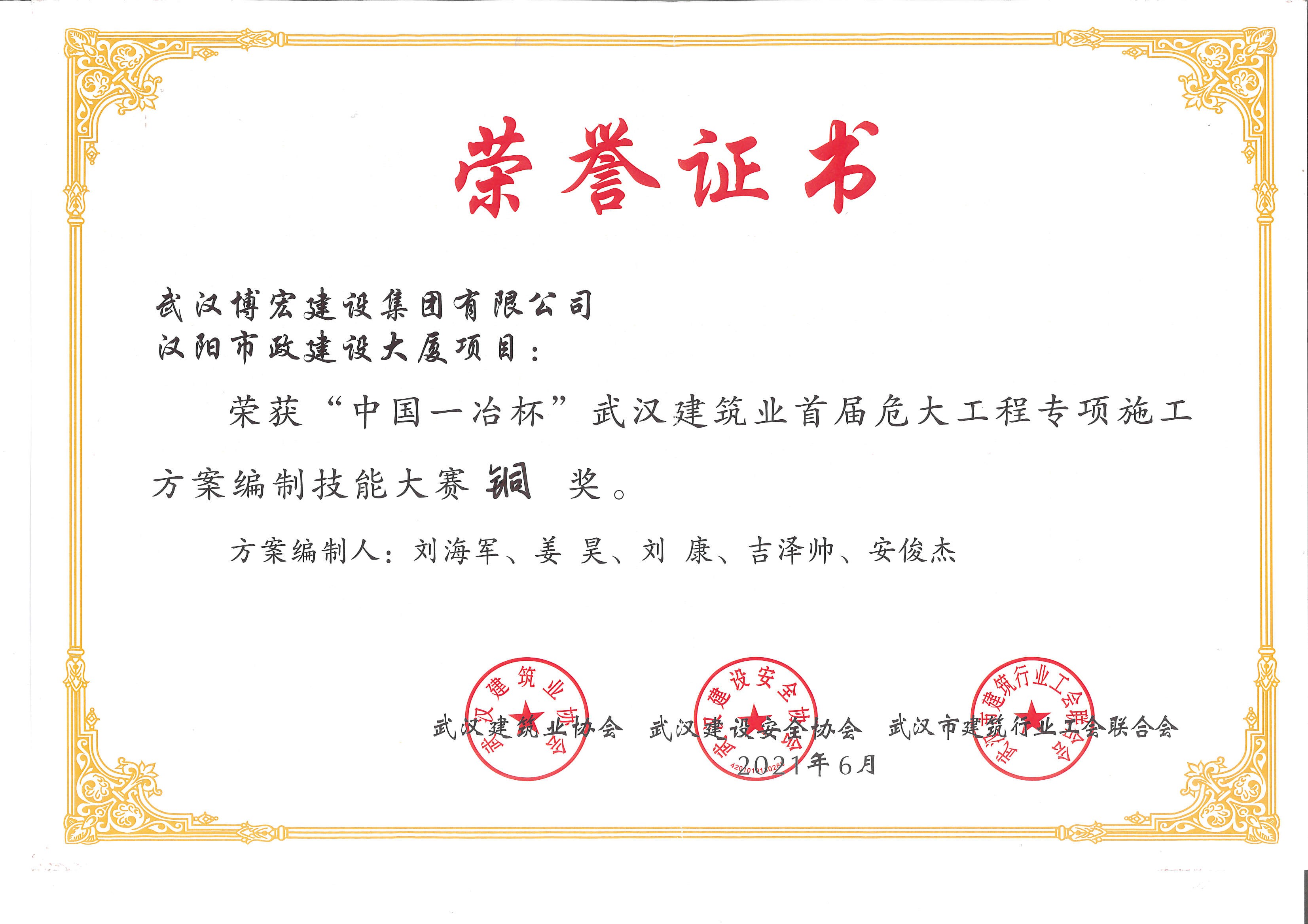 中国一冶杯武汉建筑业首届危大工程专项施工方案编制技能大赛铜奖