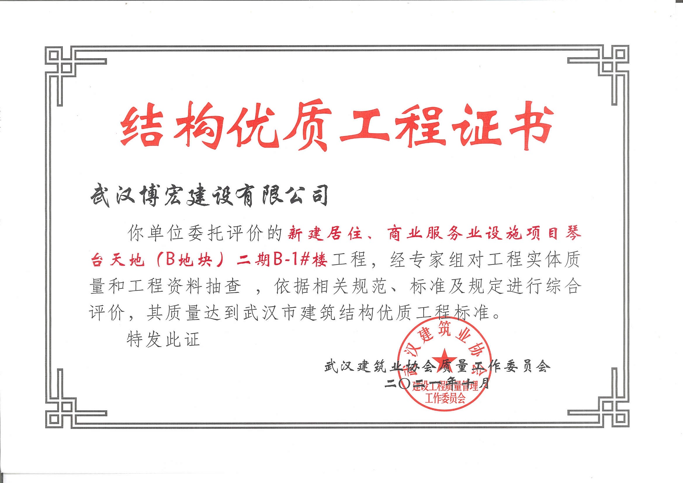 琴台天地(B地块)二期B-1#楼武汉市建筑结构优质工程