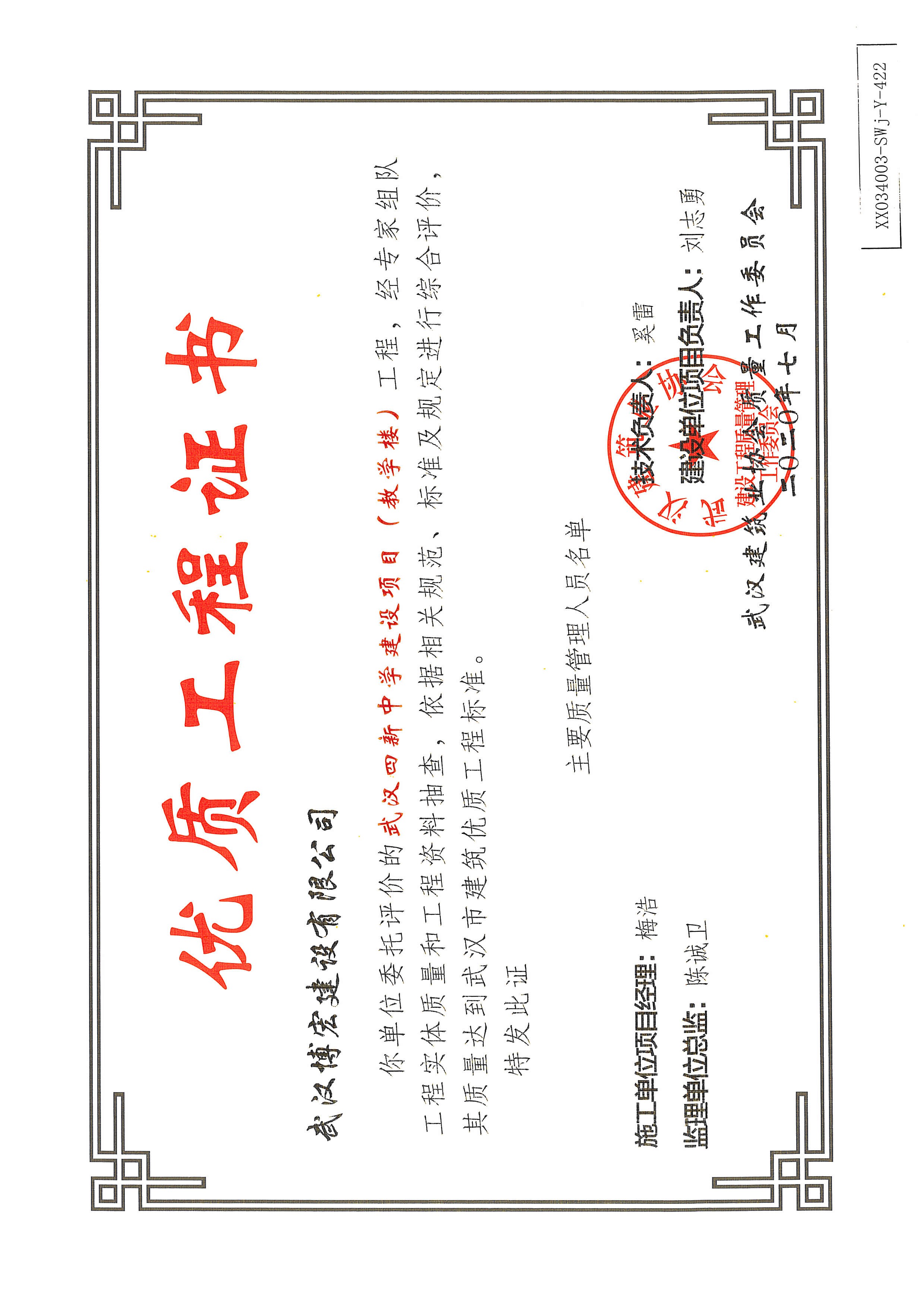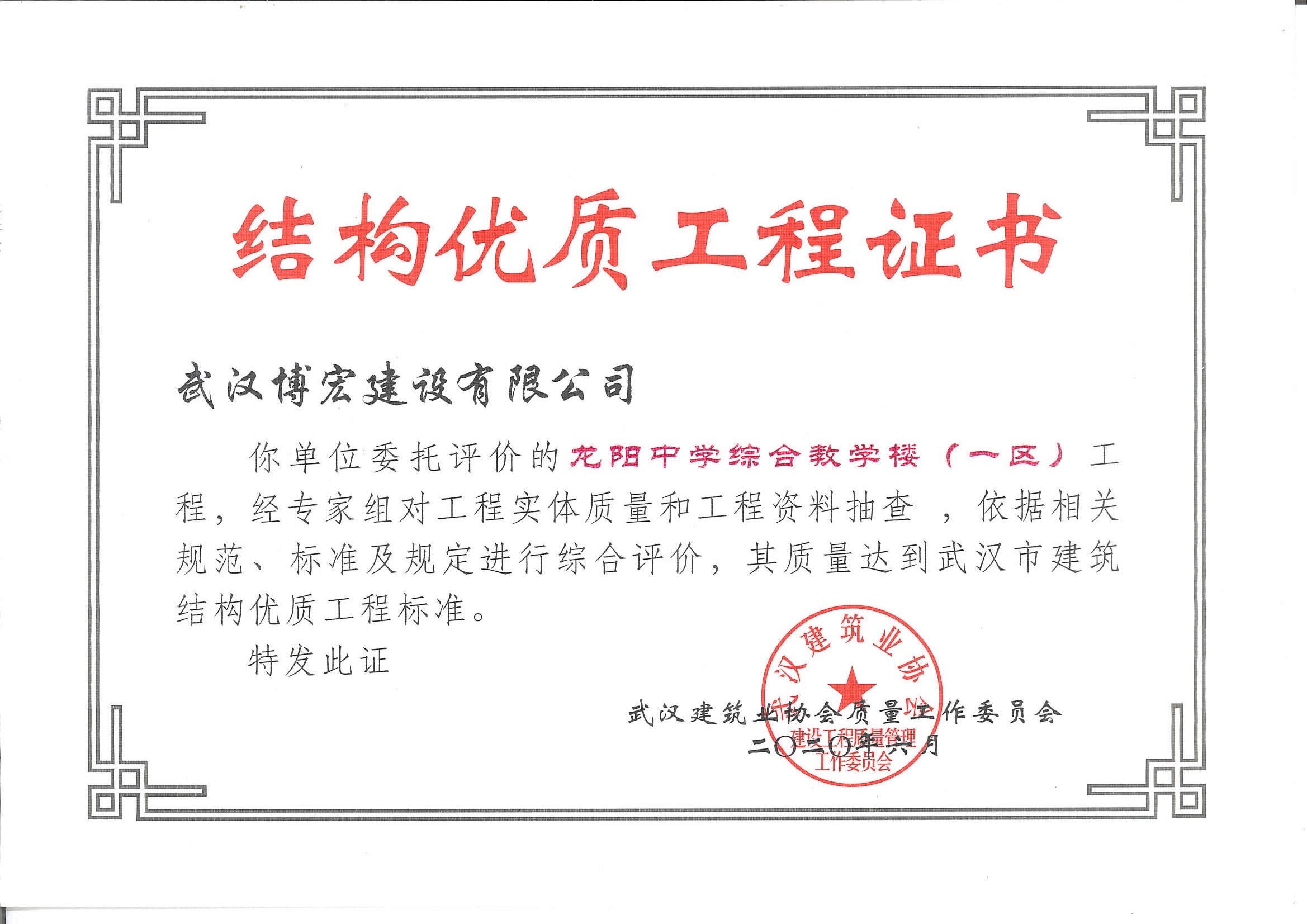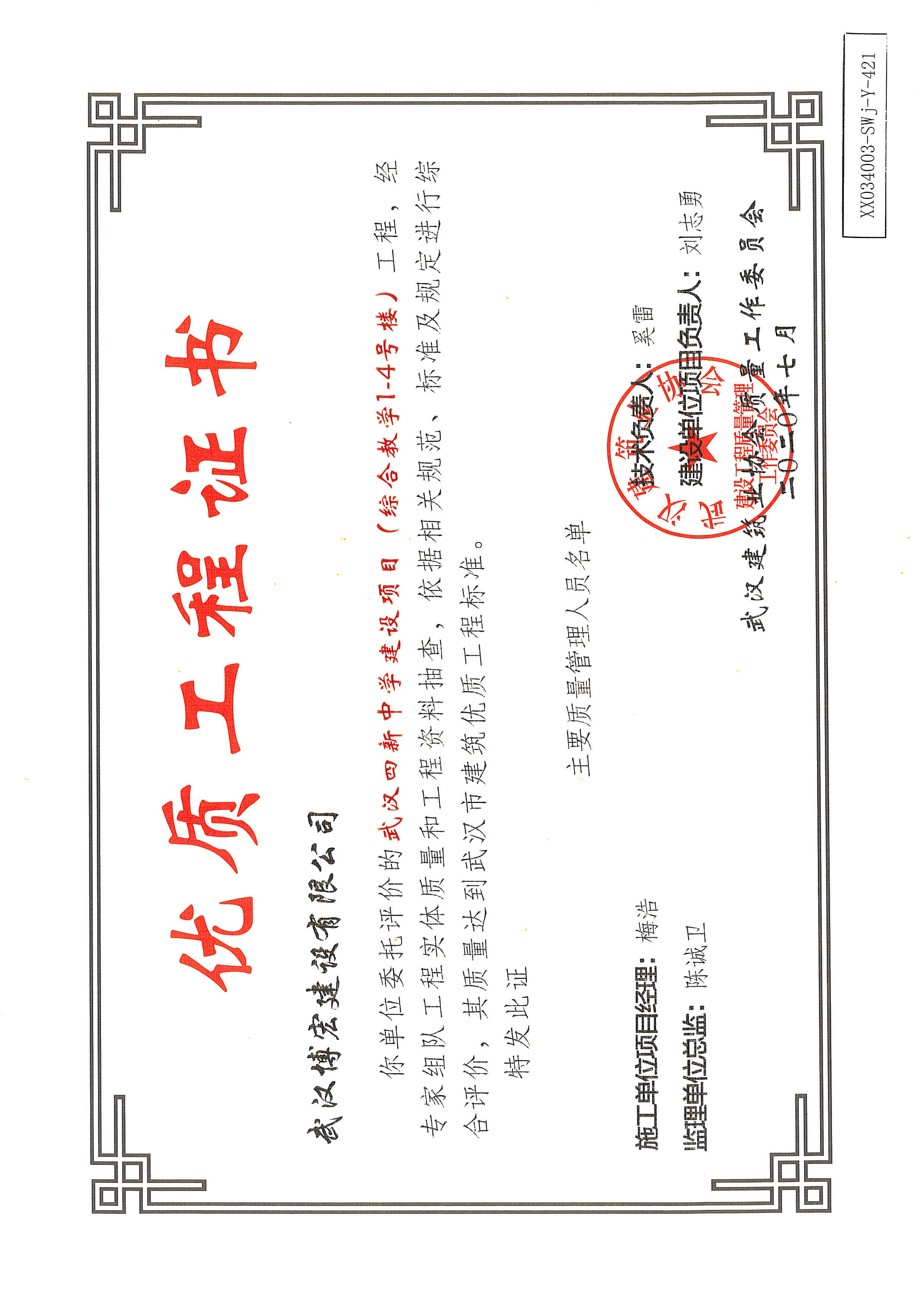 优质工程证书(武汉四新中学建设项目工程(综合教学1--4号楼)