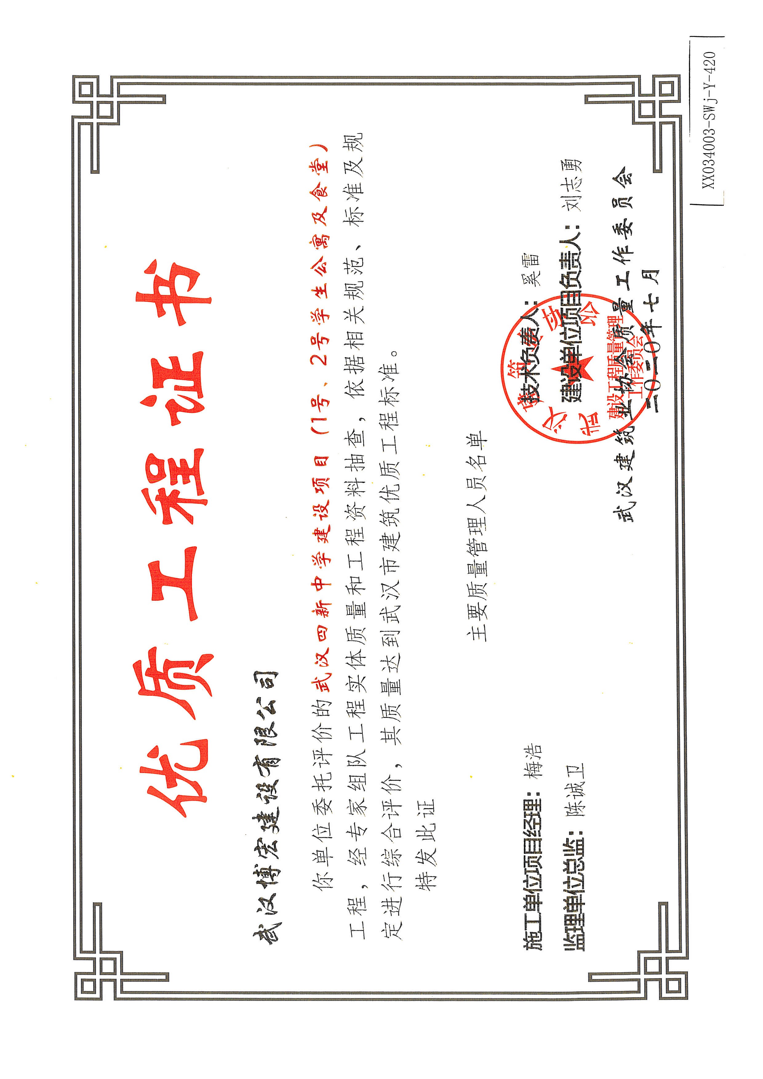 优质工程证书(武汉四新中学建设项目工程(1、2号学生公寓及食堂)