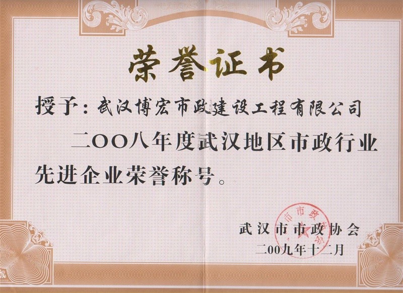2008年度武汉地区市政行业先进企业荣誉称号