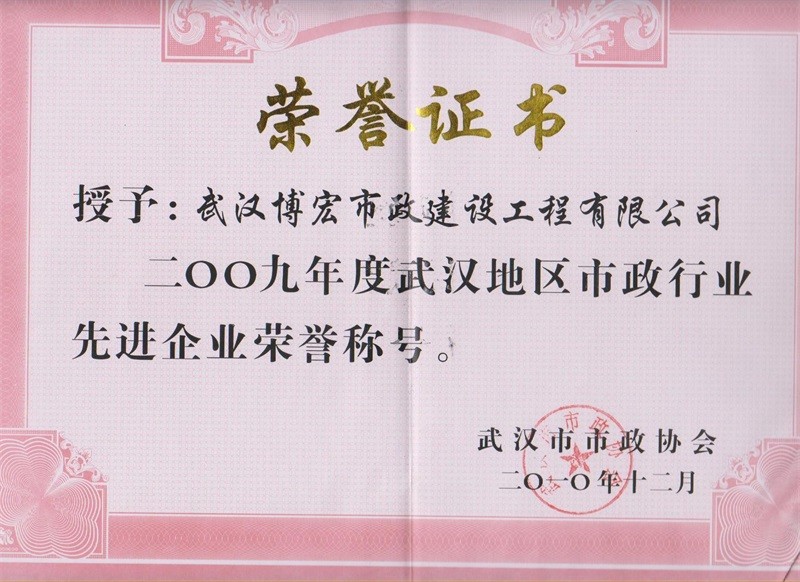 2009年度武汉地区市政行业先进企业荣誉称号